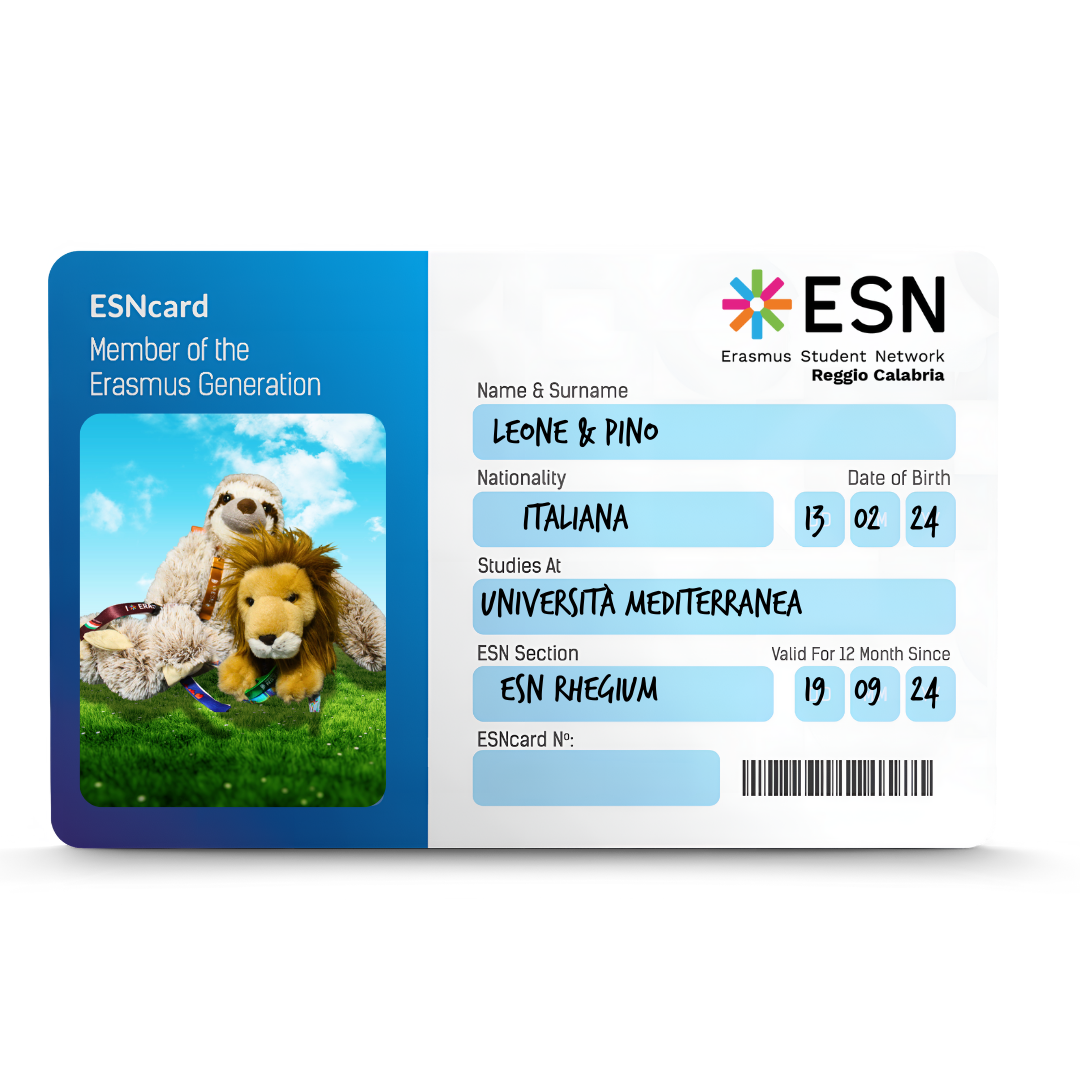 La ESNcard è il simbolo di appartenenza alla sezione di Reggio Calabria dell’Erasmus Student Network ed è lo strumento essenziale per la nuova generazione di studenti attivi e in mobilità. Per saperne di più vai sul sito ESNcard.org