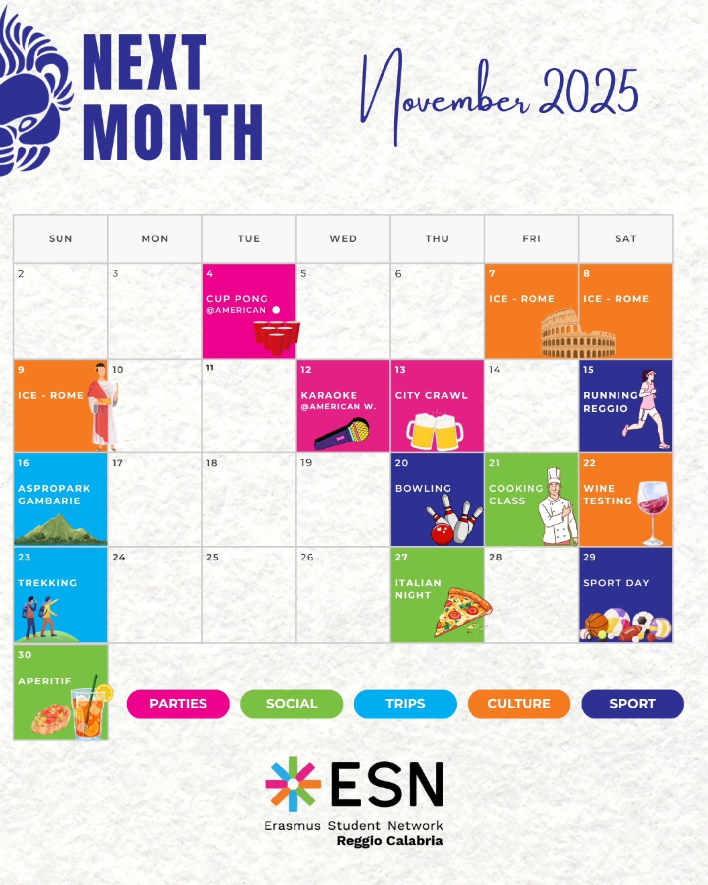Get ready for a month full of events, trips, parties, and international vibes with ESN Rhegium!